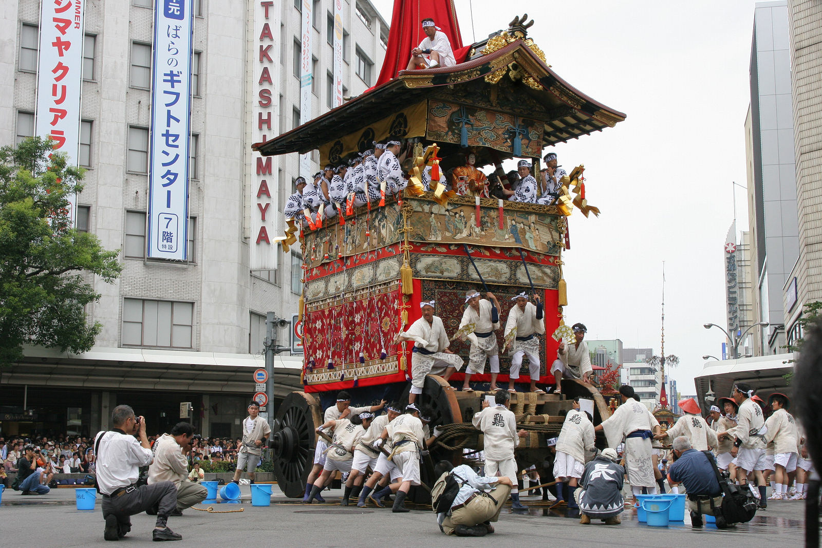 2005/07/17 祇園祭山鉾巡行/鶏鉾。交差点に用意されている、滑りをよくするための水を入れたポリバケツ。派手なライトブルーがなんとも不釣り合いな感じです。